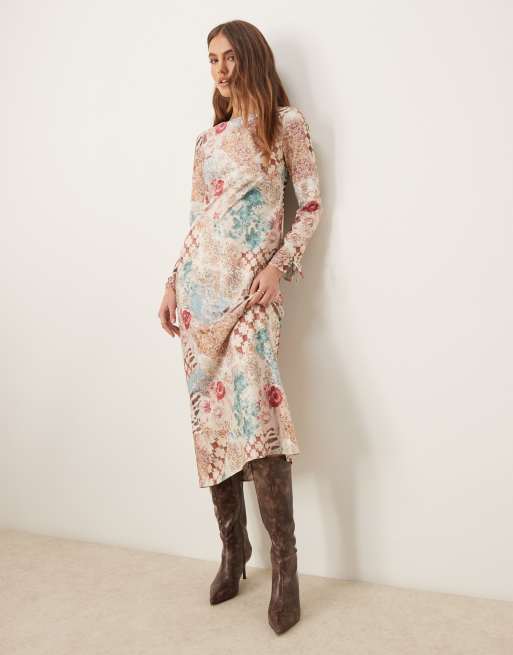 Miss Selfridge – Kolorowa sukienka maxi z długimi rękawami we wzór