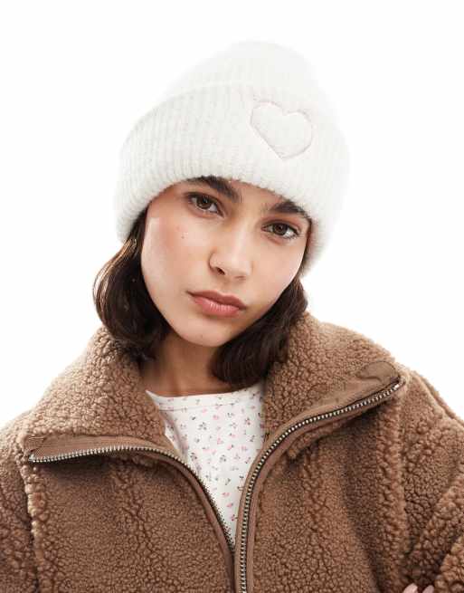 Miss Selfridge – Kremowa dzianinowa czapka beanie z wyhaftowanym sercem