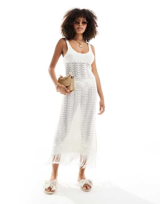 Miss Selfridge – Kremowa szydełkowana sukienka maxi z frędzlami