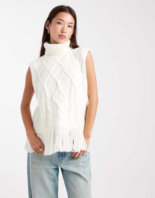 Miss Selfridge – Kremowy top oversize bez rękawów z dzianiny o warkoczowym splocie z frędzlami