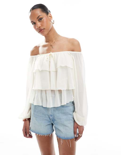 Miss Selfridge – Maślana bluzka z dekoltem bardot i falbanką
