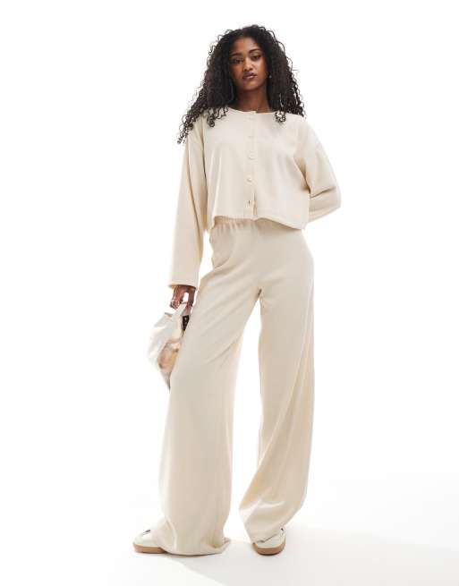 Miss Selfridge – Miękkie prążkowane spodnie z szerokimi nogawkami w kolorze kości słoniowej