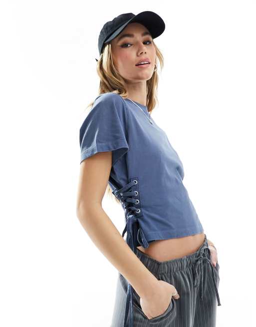 Miss Selfridge – Niebieski wiązany po bokach T-shirt z krótkimi rękawami