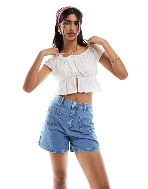 Miss Selfridge – Niebieskie jeansowe szorty z naszytymi kieszeniami