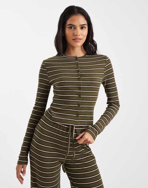 Miss Selfridge – Oliwkowy top w paski z długimi rękawami, część zestawu