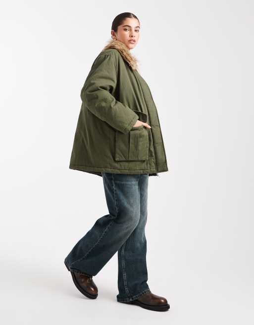 Miss Selfridge – Parka w kolorze khaki z kołnierzem ze sztucznego futra