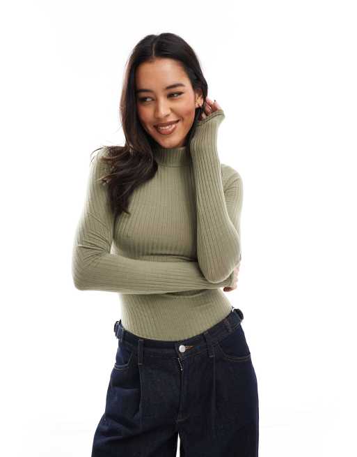 Miss Selfridge – Prążkowane miękkie body z golfem w kolorze khaki