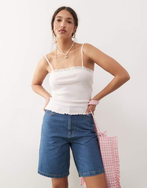 Miss Selfridge – Prążkowany jasnoróżowy top na ramiączkach z koronkowym wykończeniem