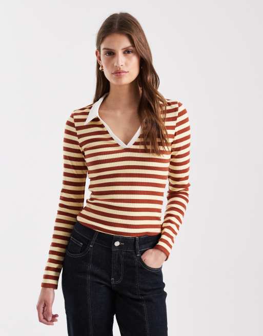 Miss Selfridge – Prążkowany top w paski z długimi rękawami i kołnierzykiem polo