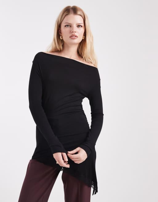Miss Selfridge – Przylegający asymetryczny top z koronkowym wykończeniem