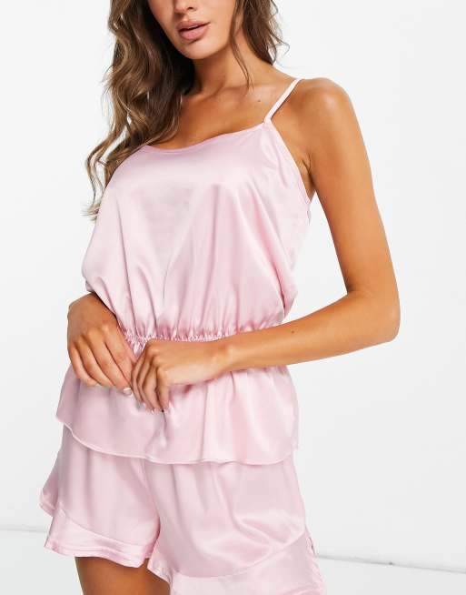Miss Selfridge – Różowa satynowa piżama z szortami i topem na ramiączkach