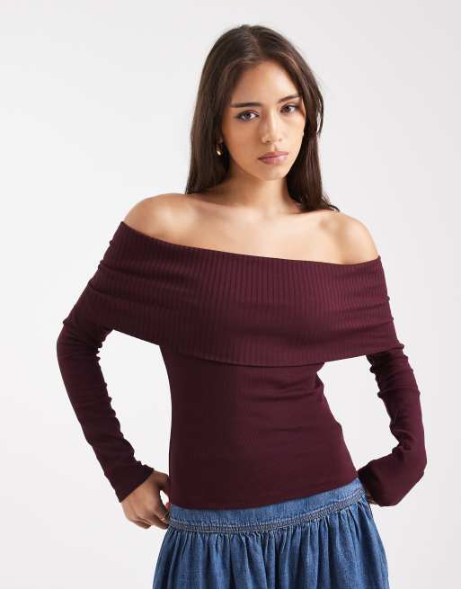 Miss Selfridge – Śliwkowy top z dekoltem bardot i prążkami różnej szerokości
