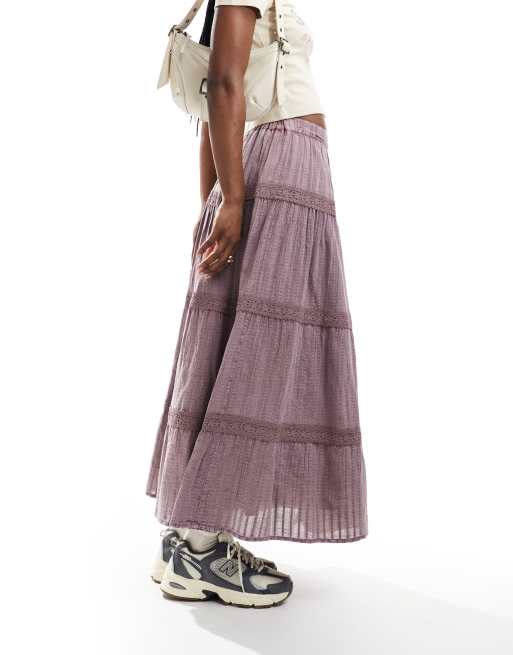 Miss Selfridge – Sprana liliowa spódnica maxi w preriowym stylu z koronkowymi wstawkami