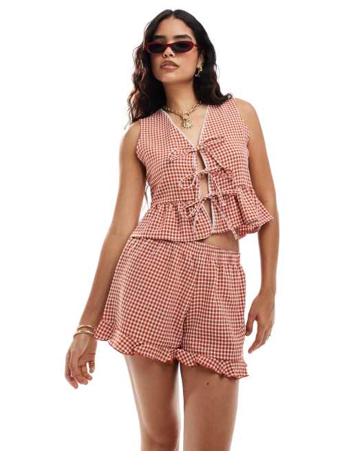 Miss Selfridge – Szorty z falbankami w rdzawą kratkę vichy