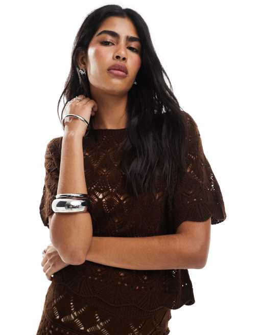 Miss Selfridge – Szydełkowany czekoladowy T-shirt plażowy, część zestawu
