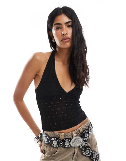 Miss Selfridge – Szydełkowany dżersejowy top z dekoltem typu halter w kształcie litery V w czarnym kolorze
