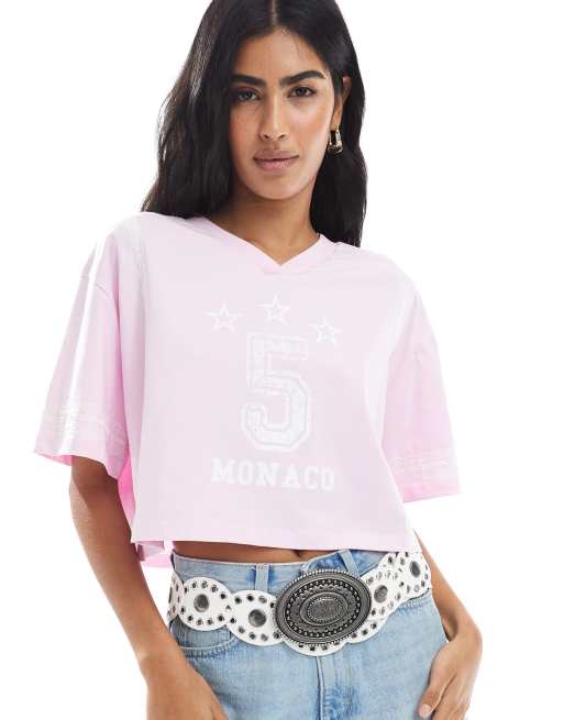 Miss Selfridge – T-shirt w stylu piłkarskim z koronkowym wykończeniem