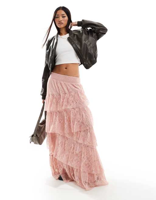 Miss Selfridge – Warstwowa spódnica maxi z różowej koronki