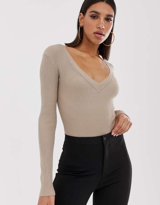 Missguided – Dzianinowe bodu z głębokim dekoltem w kolorze piaskowym