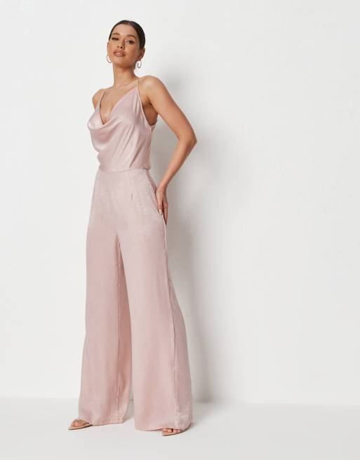 Missguided – Jasnoróżowy satynowy kombinezon z drapowanym dekoltem i szerokimi nogawkami