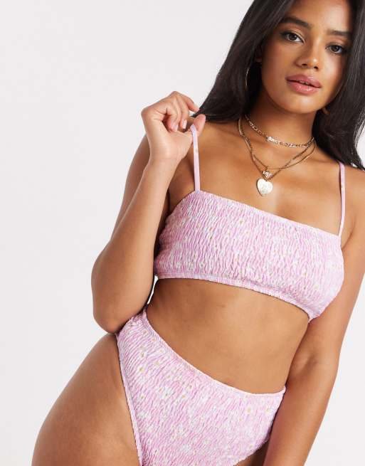 Missguided – Różowa marszczona góra od bikini w kwiaty z kwadratowym dekoltem