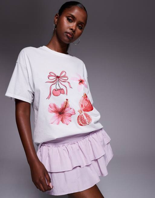Missy Empire – Biały T-shirt oversize z nadrukiem z różowymi motywami