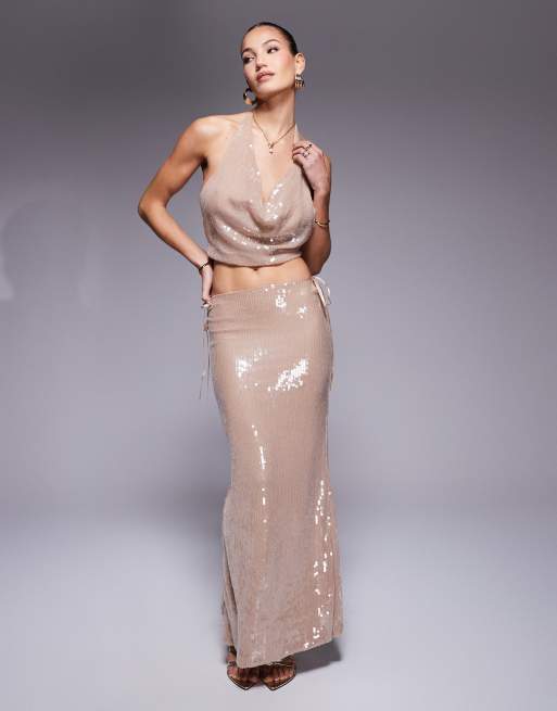 Missy Empire – Kremowy cekinowy krótki top z drapowanym dekoltem halter, część zestawu