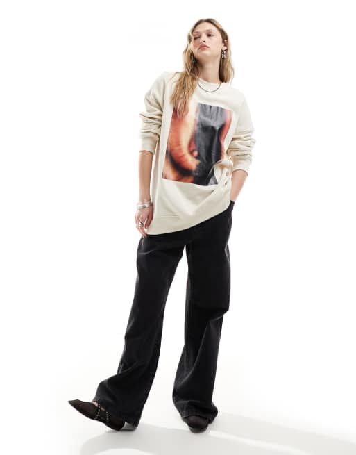 Monki – Beżowy sweter oversize z długim rękawem i grafiką z przodu
