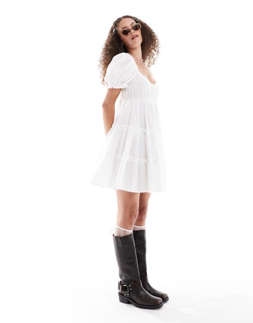 Monki – Biała warstwowa sukienka fakturowana mini w stylu babydoll z bufkami