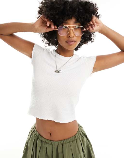 Monki – Biały marszczony T-shirt z krótkimi rękawami i falowanym brzegiem