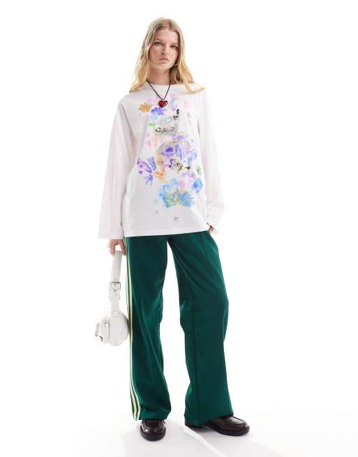 Monki – Biały T-shirt oversize z długimi rękawami z nadrukiem w kwiaty z przodu