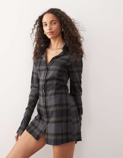 Monki – Ciemnoszara taliowana sukienka koszulowa mini z długimi rękawami w kratę