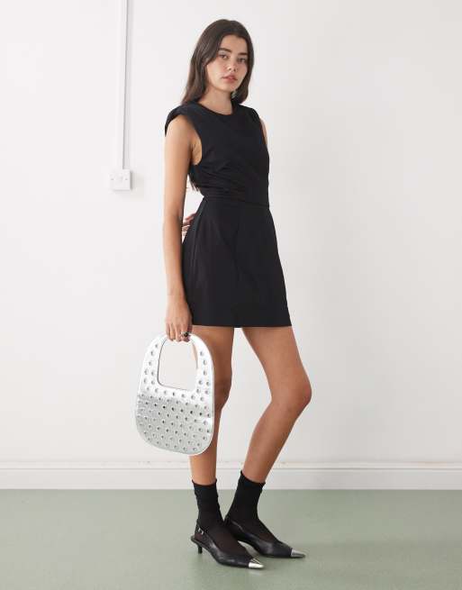 Monki – Czarna sukienka mini z poduszkami na ramionach, zwężaną talią i obszernym dołem