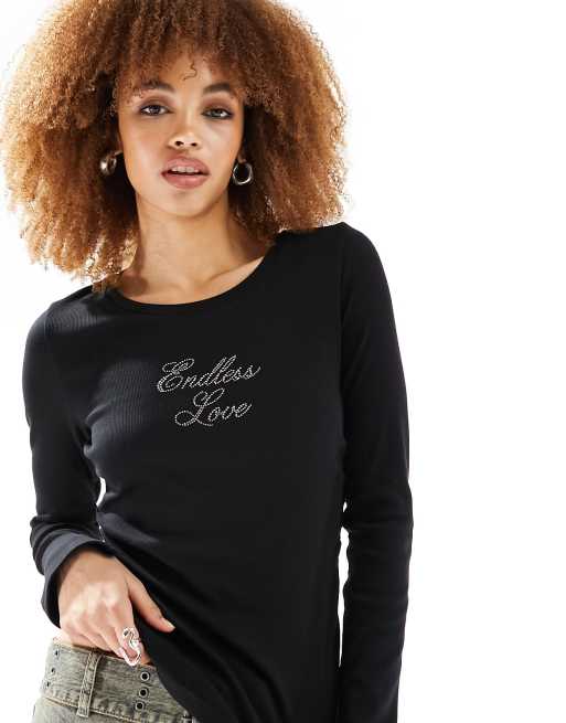 Monki – Czarny dopasowany top z długimi rękawami i napisem „Endless Love” z kryształków