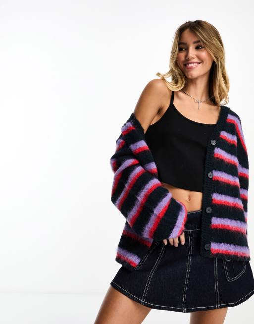 Monki – Granatowo-niebieski długi kardigan z dzianiny w paski