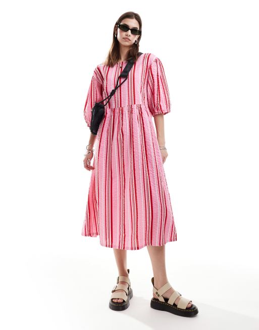 Monki – Luźna sukienka midi z kory w kolorowe paski