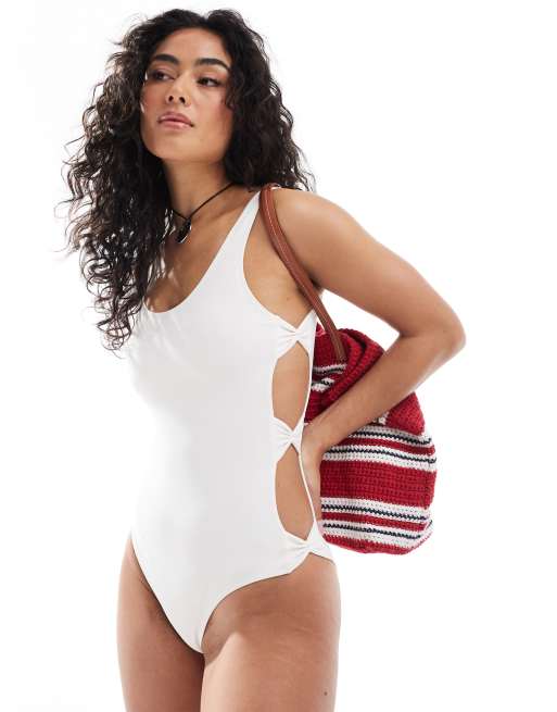 Monki – Mieszaj i łącz – Biały strój kąpielowy z wycięciami i kokardkami – tylko w ASOS