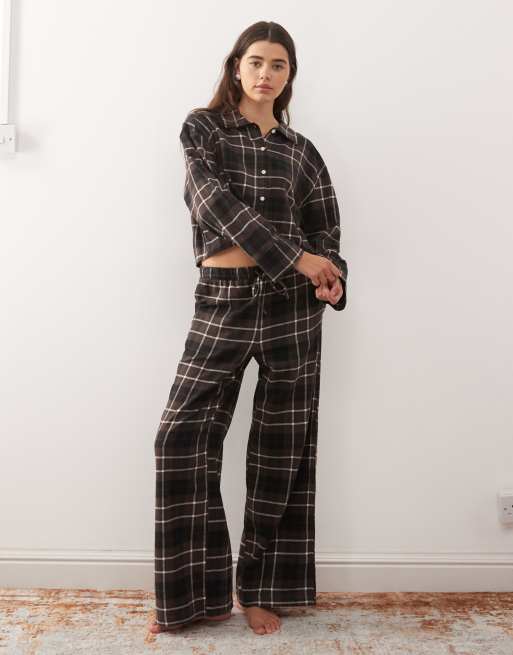 Monki – Mieszaj i łącz – Brązowe flanelowe spodnie od piżamy w kratkę