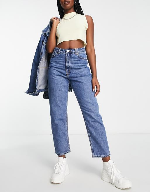 Monki – Niebieskie jeansy z prostymi nogawkami z wyhaftowanym misiem na kieszeni i z efektem sprania