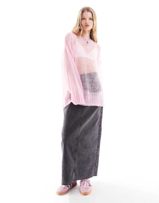 Monki – Różowy luźny sweter z fakturowanej dzianiny z prześwitującą wstawką