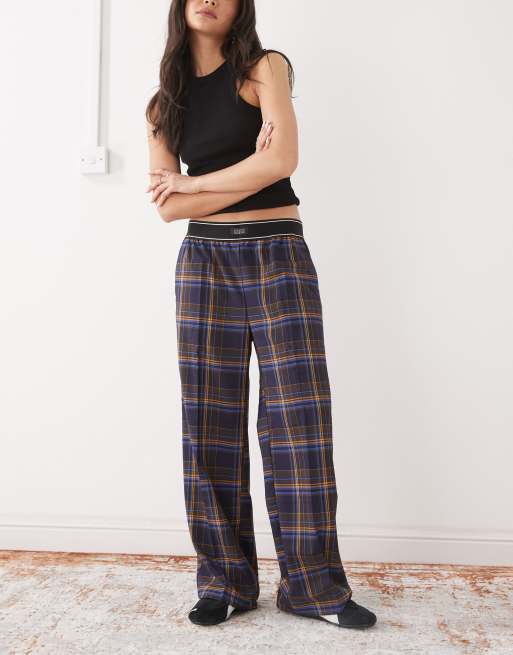 Monki – Spodnie z szerokimi nogawkami i gumką w pasie w niebieską kratę