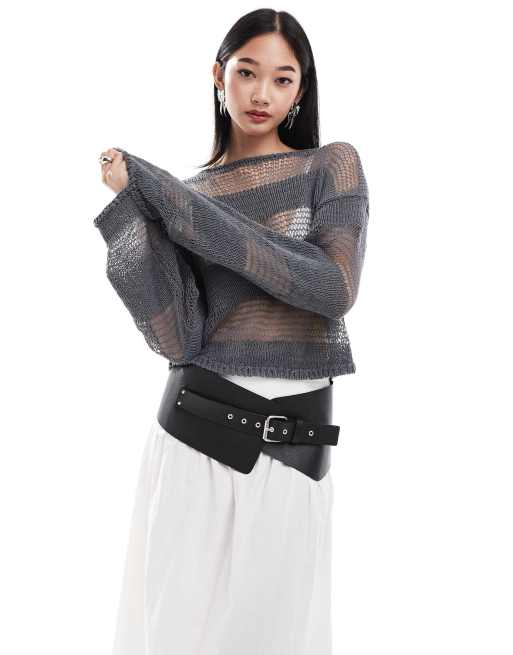 Monki – Szary dzianinowy top o luźnym kroju z długim rękawem i prześwitującymi paskami