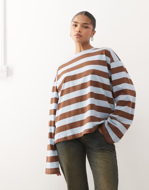 Monki – Top z długimi rękawami w jasnoniebiesko-brązowe paski