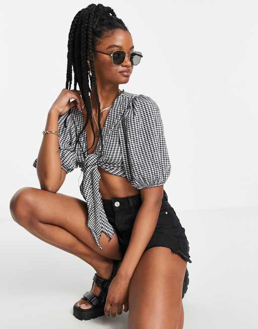 Monki – Top z wiązaniem z przodu w czarno-białą kratkę vichy
