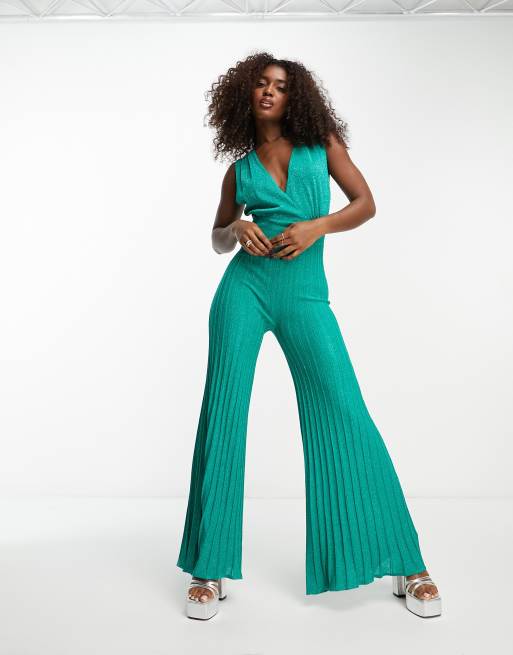 Morgan – Brokatowy zielony kombinezon z plisowanymi szerokimi nogawkami i głębokim dekoltem