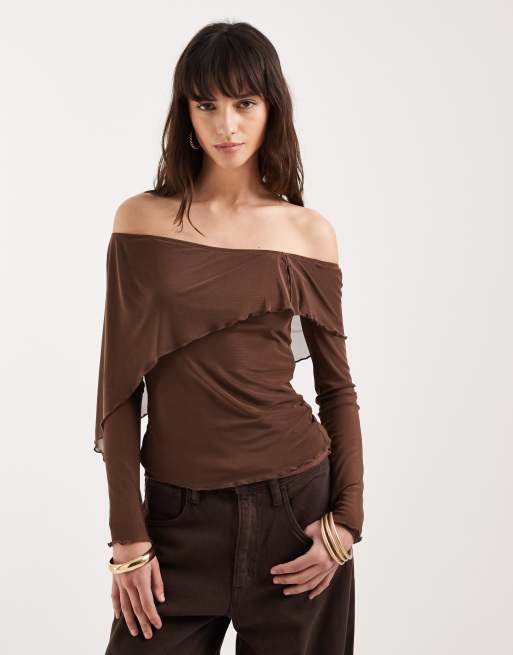 Motel – Haze – Brązowy, asymetryczny top z długimi rękawami, odsłoniętymi ramionami i ozdobną siateczką