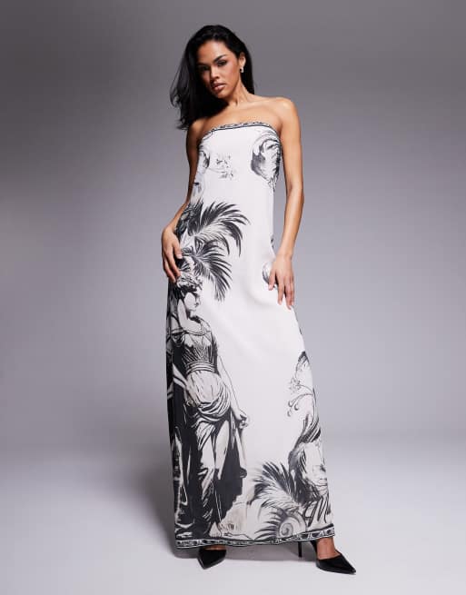 Murci Exclusive – Biało-czarna, szyfonowa sukienka trapezowa maxi z dekoltem bandeau i wzorem w palmy