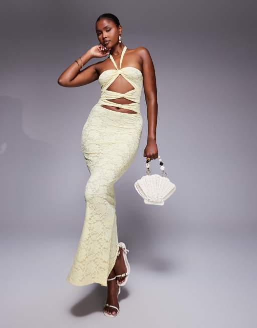 Murci Exclusive – Żółta koronkowa sukienka maxi z wycięciami i dekoltem typu halter