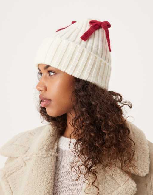 My Accessories – Kremowa prążkowana czapka beanie z odpinanymi czerwonymi kokardkami