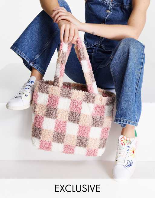 My Accessories London – Różowa torba typu tote z kożuszka w kratę